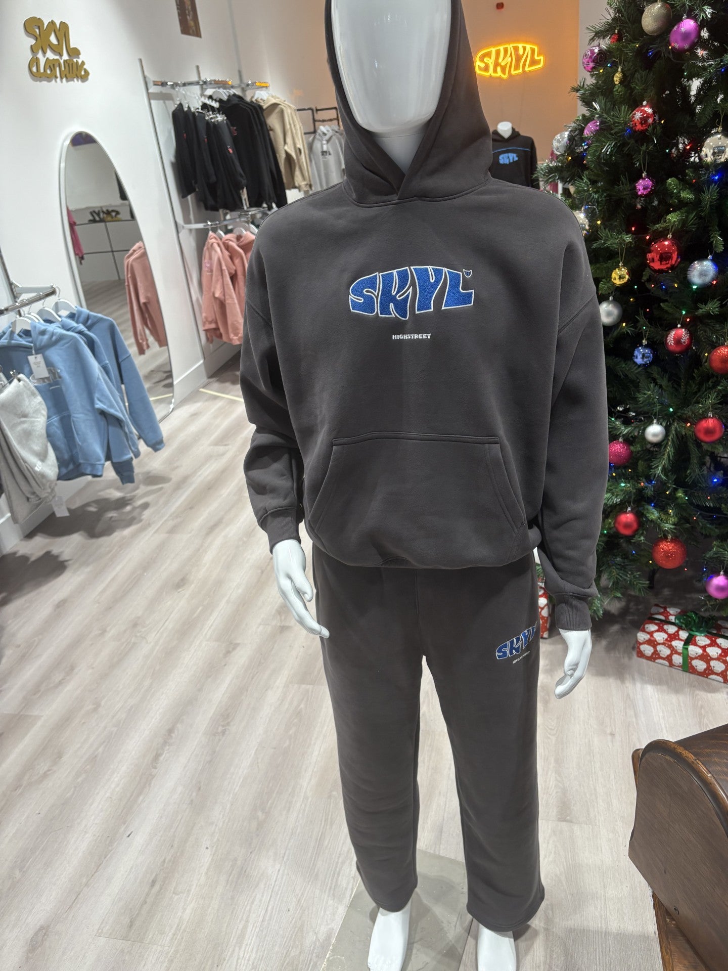 Dark Grey and Blue Signature sweatpants in a relaxed straight leg fit , crafted from a premium heavyweight cotton blend. SKYL Signature logo embroidered on the left leg.